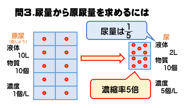 ⑤2×5という計算式は、尿量に濃縮率の数を掛けている事に等しいことを確認させる。
